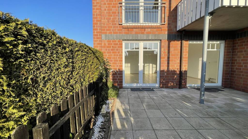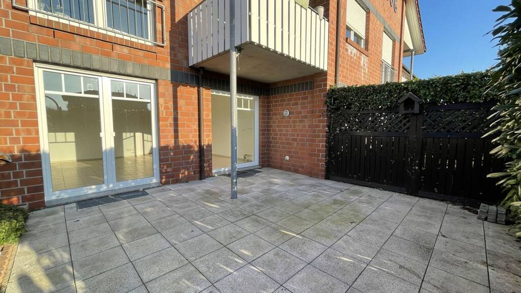 Der helle Wohn- und Essbereich bietet direkten Zugang zur sonnigen Terrasse, die mit einem praktischen Wasseranschluss ausgestattet ist und zum Entspannen im Freien einlädt. Die vorhandene Einbauküche ist funktional gestaltet und fügt sich harmonisch in das Gesamtbild der Wohnung ein.