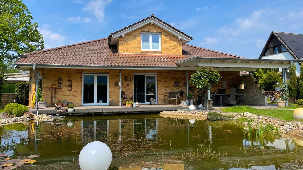 Hier präsentiert sich ein außergewöhnliches Haus, das mit vielen attraktiven Eigenschaften überzeugt ! Über einen geräumigen Flur führt der Weg in einen eigenen Bürobereich mit Badezimmer, geradeaus kommt der Besucher in eine lichtdurchflutete Wohnlandschaft mit bezauberndem Blick in einen liebevoll angelegten und blickgeschützten Garten mit einem Zierteich und bestaunenswertem Fischbestand! Das Wohnzimmer ist sehr geräumig und mit bodentiefen Fenstern hell belichtet. Ebenerdig gelangt man in einen hochwertig angelegten Garten mit mediterranem Flair, ausgestattet mit einem Teich für Zierfische, einem hübschen Gartenhäuschen und Bewässerungstechnik! Neben einer modernen Küche befinden sich ein Arbeitszimmer, ein Hauswirtschaftsraum und ein Abstellraum im Erdgeschoß! Im ersten Geschoß liegt ein modernes Badezimmer mit Massagewanne und Dusche. Die Räume überzeugen durch Geräumigkeit und praktische Accessoires wie Ankleidebereich und Einbauschränke. Angrenzend an die Doppelgarage mit großzügig bemessener Länge befindet sich ein zweiseitig begehbarer, heller Allzweckraum, in dem die Haustechnik installiert ist. Hier ist zusätzlicher Stauraum im Spitzboden vorhanden. Ferngesteuerte Bewässerungstechnik, ein Gartenhaus und Außenbeleuchtung runden das Angebot ab! Eine Freistellung erfolgt nach Vereinbarung!