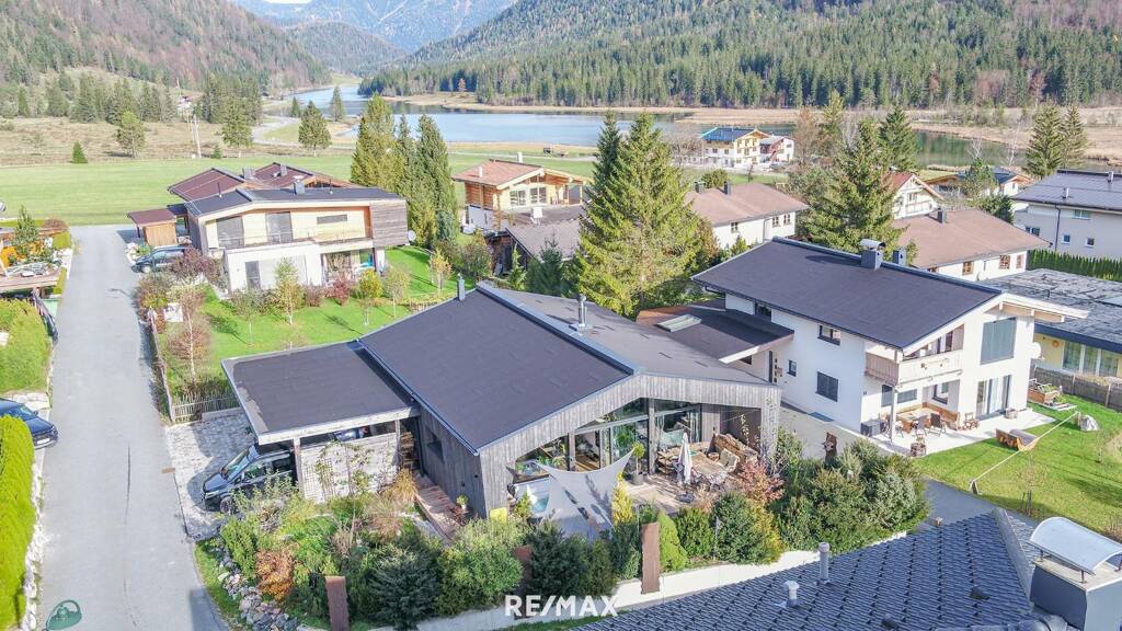 In fußläufiger Lage zum Pillersee gelegen liegt das erst vier Jahre alte Haus in leichter Hanglage. Die Inhaber nutzten diese Hanglage durchdacht aus und errichteten zwei getrennte Wohneinheiten. Im oberen Bereich betritt man das Haus über die Diele mit Blick in den Wohnessraum. Ein zentral situierter Kachelofen trennt den großen Wohnbereich mit offenem Dachstuhl und den Essbereich mit Koch Insel.