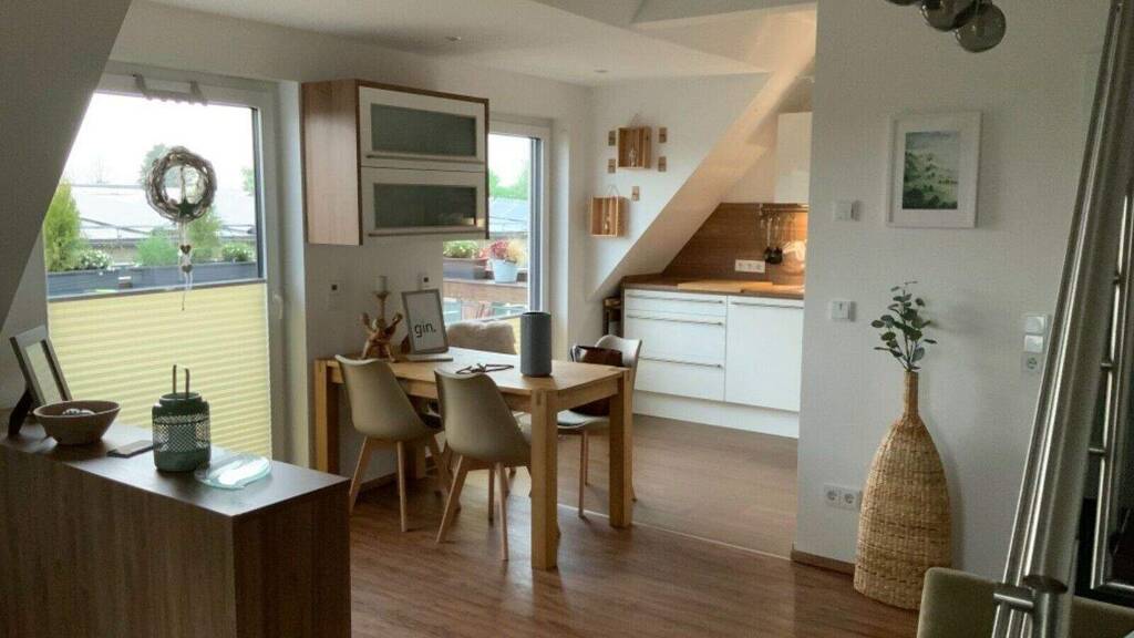 Zur Vermietung steht hier vorübergehend die Wohnung meines Sohnes da er noch einige Zeit in Australien lebt und arbeitet. Die Wohnung befindet sich in fußläufiger Citynähe! Frisch renoviert, voll eingerichtet und sehr gut ausgestattet unterteilt sie sich im Obergeschoss mit 2 Schlafzimmern, voll ausgestattete Wohn/Küche mit Balkon, 1 Duschbad, Abstellraum und Hauswirtschaftsraum. Im Wohnzimmer führt eine schmale Treppe in das ausgebaute Dachgeschoss, das offen gestaltet als Homeoffice oder/und Gästezimmer genutzt werden kann. Die Warmmiete beinhaltet auch WiFi und Magenta. Für Ihr Auto/ Fahrräder ist eine Garage und ein Stellplatz vorhanden. Koffer packen, einziehen, wohlfühlen! Kaution: eine Monatsmiete!