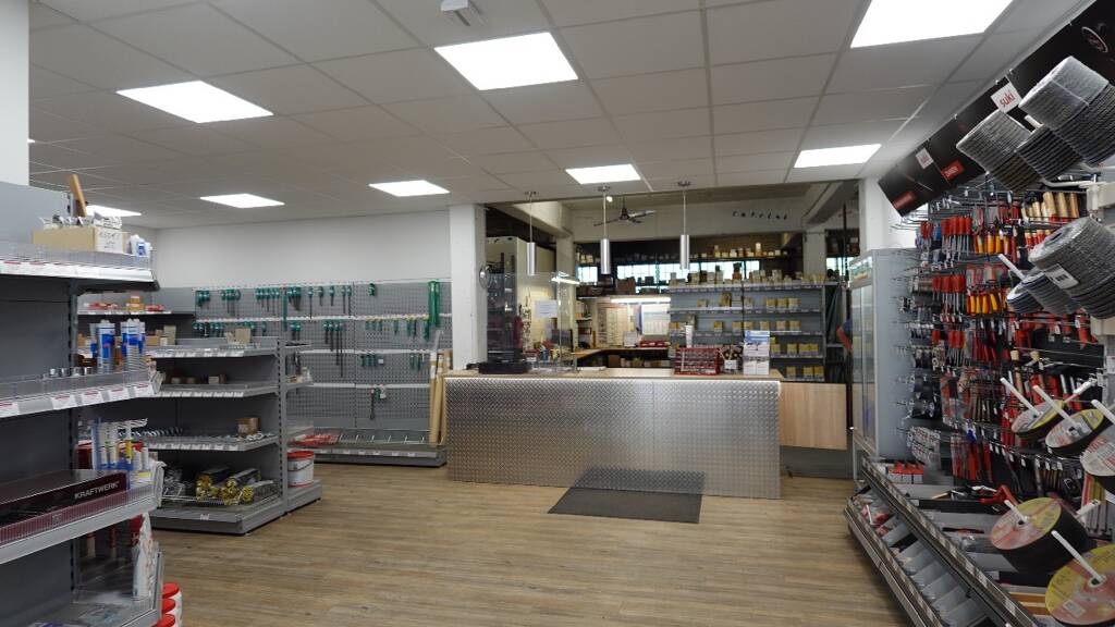 Eine abgehängte Deckenrasterkonstruktion, mit integrierter Beleuchtung, sorgt für eine gleichmäßige Ausleuchtung im Ausstellungsbereich des Gewerbes im EG. Die weiteren Beleuchtungsinstallationen sind eher einfach.