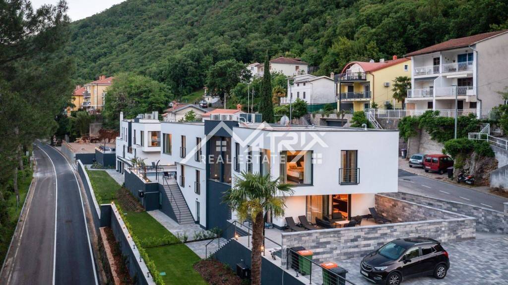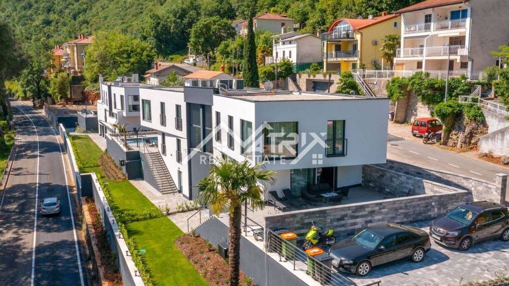 Wir präsentieren Ihnen diese geräumige, moderne Villa mit Swimmingpool, nur 500 Meter von den wunderschönen Stränden der Riviera von Opatija entfernt. Die Villa ist so gestaltet, dass alle Fenster der Südfassade einen schönen Blick auf das Meer und die Kvarner-Bucht bieten. Diese Art von Immobilie ist eine echte Rarität auf dem Immobilienmarkt!