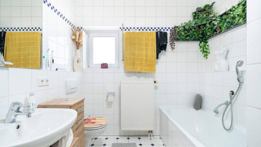 Sanitärausstattung: Badezimmer mit Fenster I Dusche I Badewanne I Toilette und Einzelwaschbecken. Innenliegendes Gäste-WC mit Einzelwaschbecken und Toilette. Die Waschmaschine findet im Waschkeller des Hauses oder in der Küche der Wohnung ihren Platz.