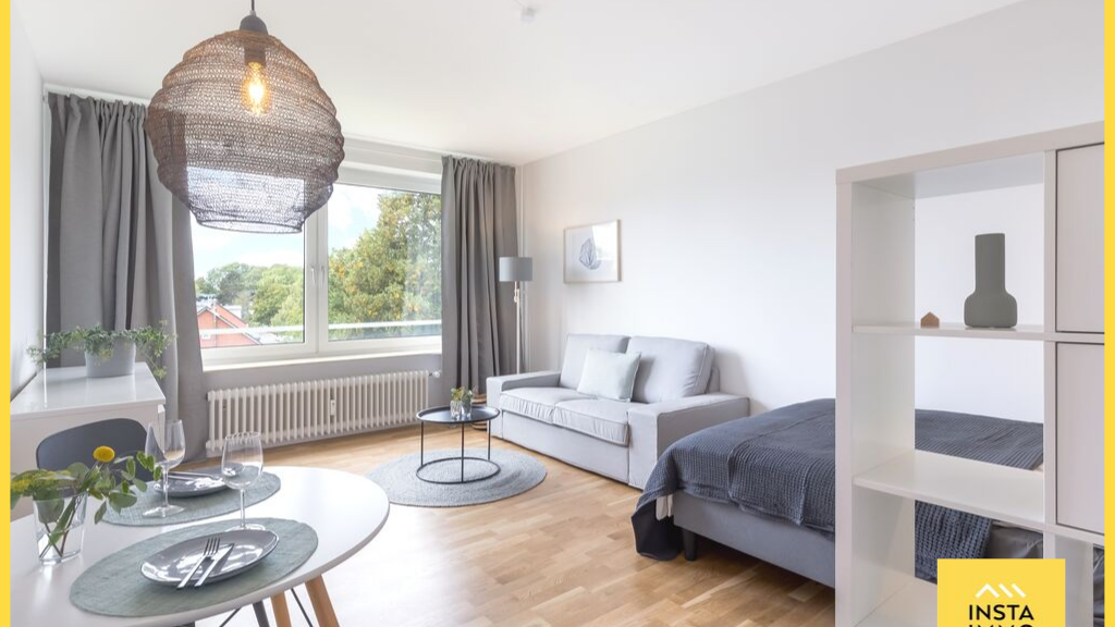 Diese gepflegte Studio im 3. Obergeschoss eines achtgeschossigen Wohnhauses in Hamburg-Eimsbüttel überzeugt durch ihre durchdachte Raumaufteilung und eine ruhige, grüne Umgebung. Auf einer Wohnfläche von rund 34 m² erwartet Sie ein helles Wohn- und Schlafzimmer mit angenehmer Westausrichtung, das am Nachmittag und Abend von reichlich Sonnenlicht durchflutet wird und einen erholsamen Blick ins Grüne bietet.