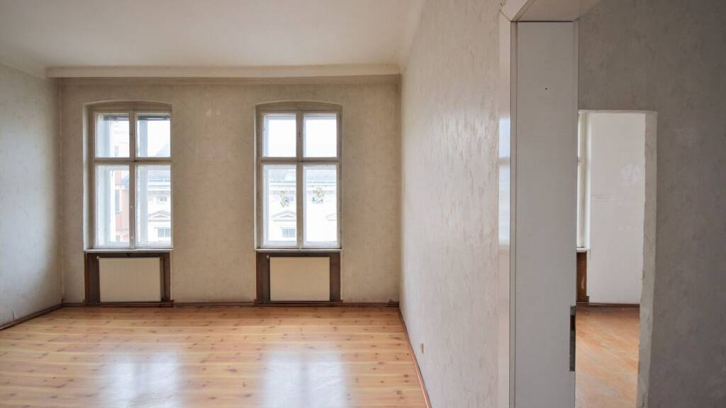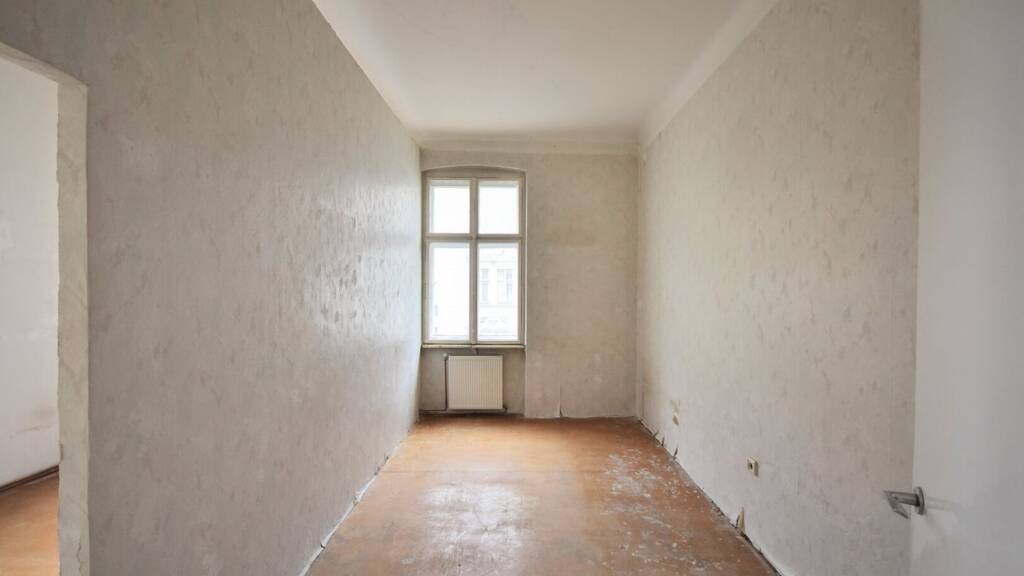 Die Wohnung ist sanierungsbedürftig und bietet eine funktionale Raumaufteilung mit Entwicklungspotenzial: Vom geräumigen Vorraum gelangt man in das große Hauptraumzimmer, von dem aus zwei kleine Kabinette erreichbar sind. Diese können flexibel als Schlafzimmer, Homeoffice oder Gästezimmer genutzt werden. Das Badezimmer mit Fenster ist mit Dusche und WC ausgestattet.