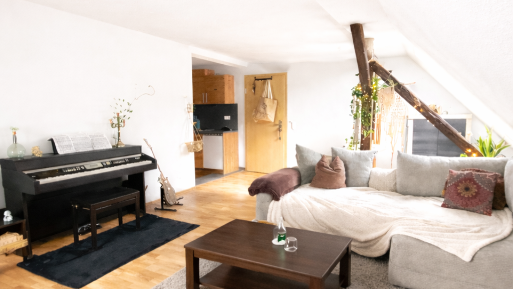 Die Wohnung selbst besticht durch ihre gemütliche Atmosphäre unter dem Dach. Warme Holztöne, sichtbare Elemente und die charmanten Dachschrägen verleihen den Räumen eine besondere Wohnlichkeit. Trotz der Schrägen ist die Möblierbarkeit sehr gut gegeben, sodass sämtliche Räume funktional und komfortabel genutzt werden können. Der offene Wohn- und Essbereich bildet das Herzstück der Wohnung. Er wirkt hell und freundlich und bietet ausreichend Platz zum Entspannen. Die angrenzende kompakte Pantryküche fügt sich harmonisch in das Raumkonzept ein. Das Schlafzimmer bietet Platz für ein großes Bett sowie einen Kleiderschrank und vermittelt durch den warmen Bodenbelag eine angenehme Ruhe. Das modern geflieste Tageslichtbad ist mit Dusche und Waschmaschinenanschluss ausgestattet - ein komfortables Detail im Alltag.