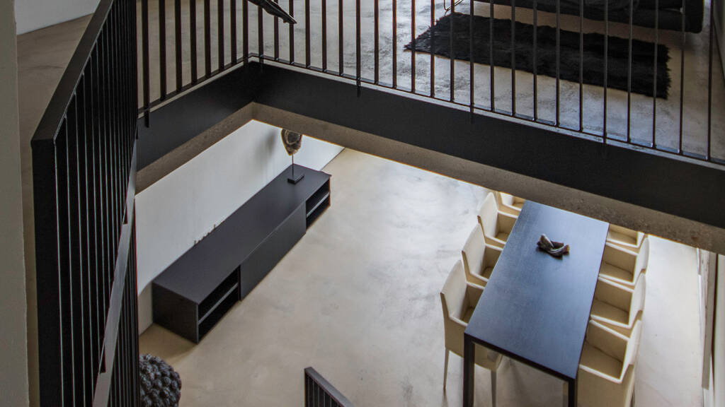 Im Loft befindet sich ein Designer-Esstisch mit 4 Stühlen (Gunther Lambert, Fritz Hansen), ein 180 x 200 m großes Bett und einen 3 m großen Kleiderschrank (Poliform), ein 4-Sitzer-Ledersofa (Minotti Hamilton Islands) und eine Wohnwand (Molteni).