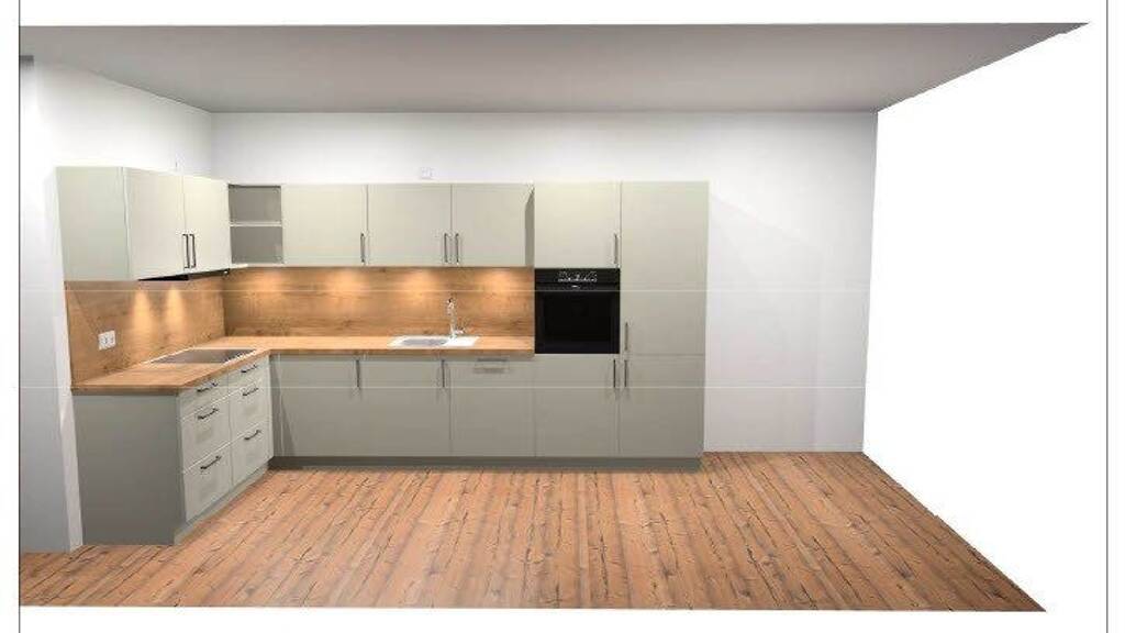 Die Wohnung wird mit einer hochwertigen Einbauküche ausgestattet: Fronten in elegantem Platingrau, schwarze Metallgriffe und eine Arbeitsplatte in Chalet Eiche sorgen für ein modernes, harmonisches Gesamtbild.