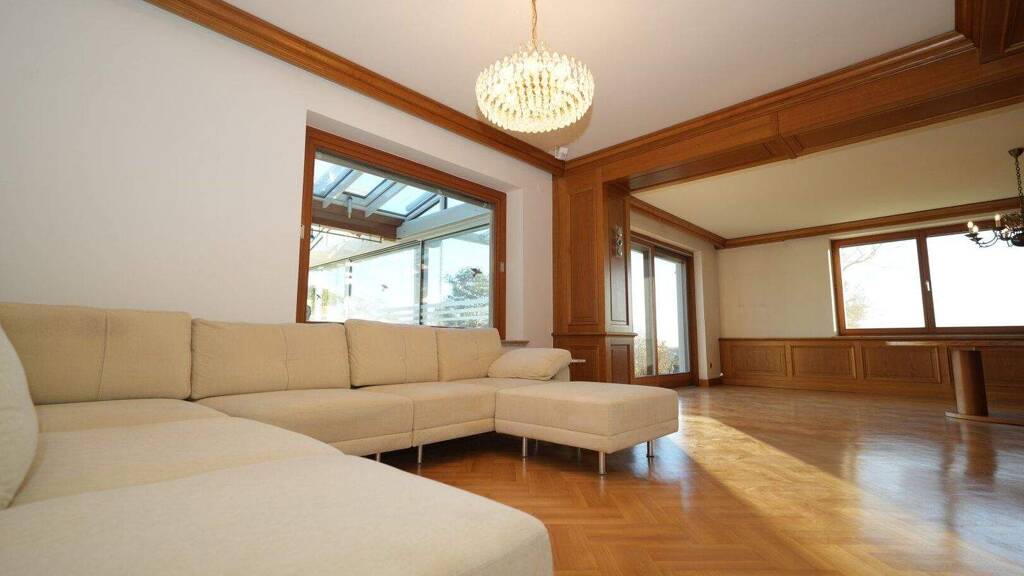 Fußbodenheizung, Kamin und Klimaanlage sorgen für Komfort, ergänzt durch eine moderne Einbauküche und stilvolle Sanitärbereiche. Praktische Extras wie drei Lagerräume im Keller, ein eigener Bunker sowie Garage und Stellplätze runden das Angebot ab.