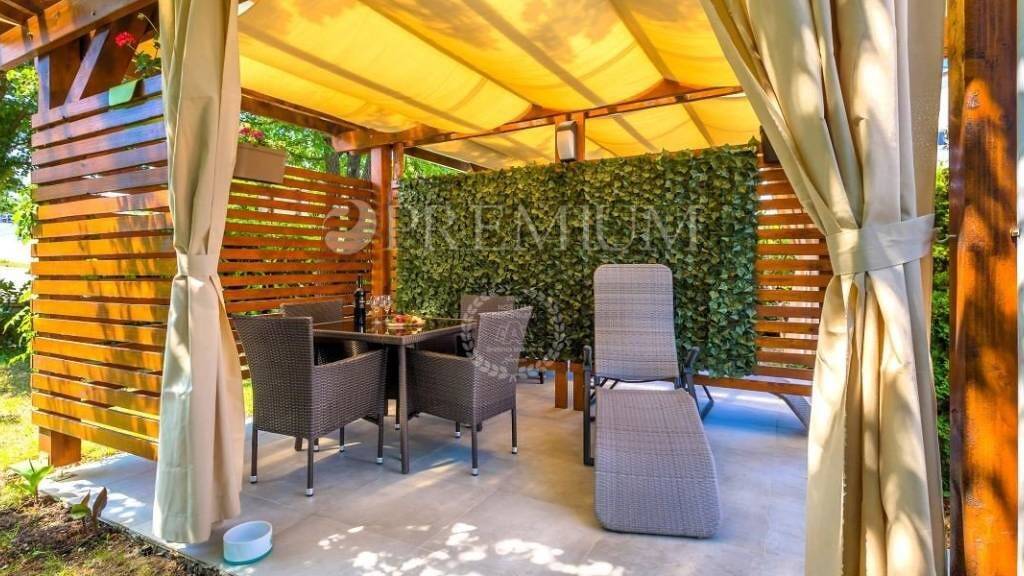 Der schön angelegte Garten verfügt über eine Sommerküche und einen gemütlichen Bereich zum Entspannen und Essen im Freien. Ein Parkplatz gehört zur Wohnung.