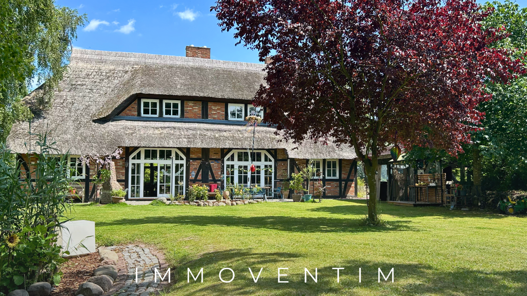 Das Reetdach wurde 2021 vollständig neu eingedeckt und verleiht dem Anwesen seinen unverwechselbaren Charme. Im Inneren erwarten Sie vier Bäder, zwei Kamine, edle Bodenbeläge, eine Einbauküche im Landhausstil sowie liebevoll gestaltete Wohnräume mit hochwertigen Details.