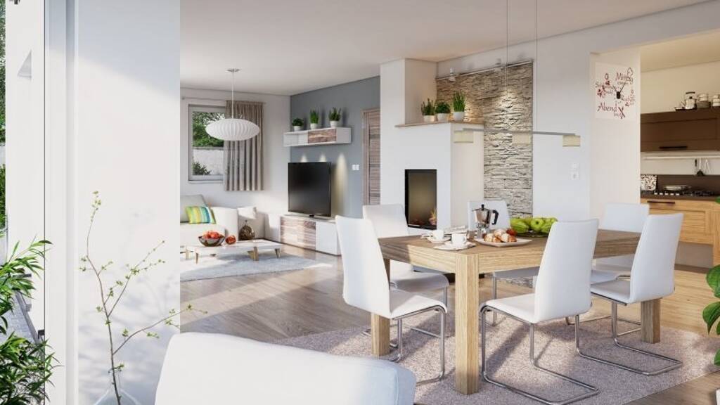 Schon auf den ersten Blick entdecken Sie bei dieser Haus-Idee von RENSCH-HAUS CLOU 156 die überaus familienfreundliche Überlegung, sowie die klare und überlegte Designsprache. Diese Grundrisslösung mit einer Gesamtfläche von über 150 m² begrüßt Sie und Ihre Gäste bereits im Erdgeschoss mit einem großzügigen Dielenbereich - mit viel Platz auch für Ihre Garderobe. Wenn Sie es wünschen ist im geräumigen Gäste-WC die Einplanung einer Dusche möglich. Das Erdgeschoss hat - mit direktem Zugang in Ihren Garten - ein Homeoffice zu bieten, das Sie auch als Gästezimmer nutzen können. Von der offenen Küche aus erreichen Sie Ihren Wohn- und Essbereich: genießen Sie hier mit Ihren Lieben ein großzügiges Wohngefühl. Als weiteres Highlight sorgt der Übereck auskragende Cube mit Rundum-Verglasung für viel Licht in Ihrer gemütlichen Relax-Zone. Im Dachgeschoss freuen sich Ihre Kinder in den beiden großzügigen und sehr hell gestalteten Räumen auf ihre persönliche Welt. Ein großzügiges und sehr variables Familienbad lässt keine Wünsche offen. Das geräumige Elternschlafzimmer mit integriertem Ankleidebereich garantiert Ihnen nach einem anstrengenden Arbeitstag einen idealen Rückzugsort zum Entspannen. Die Außenansicht erhält durch einen dritten Giebel mit einer attraktiven Flachdach-Gestaltung ein sehr modernes und zeitgemäßes Gesicht.