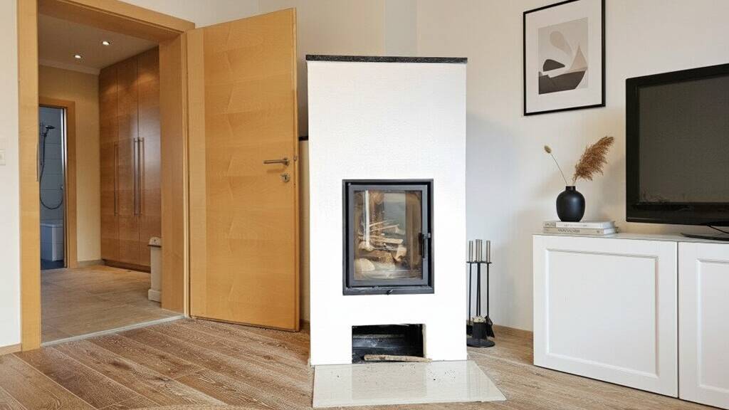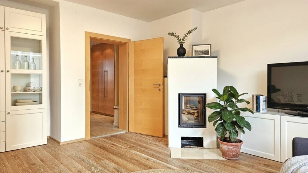 Der Wohnbereich bildet das Herzstück der Wohnung. Ein zentral platzierter Kachelofen mit Sichtglas sorgt für eine angenehme Wärme und kann den Großteil der Wohnung beheizen. Ergänzend steht in allen Räumen eine Elektroheizung zur Verfügung. Zusätzlich bietet ein weiterer Kaminanschluss im Eckzimmer die Möglichkeit, eine Gas- oder Pelletheizung zu installieren.