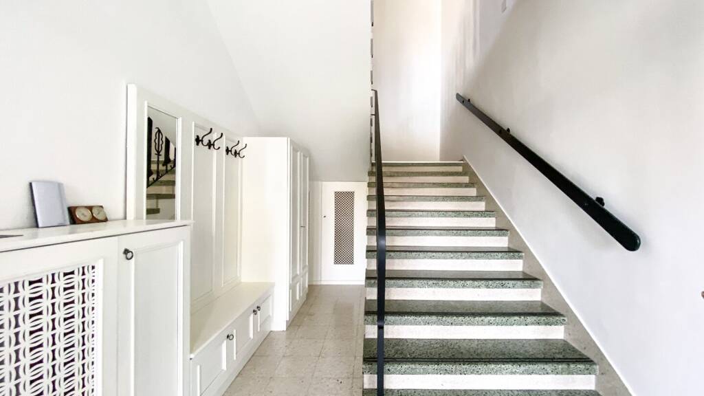 Öffnet man die Eingangstüre und betritt das Haus, gelangt man in den im Erdgeschoss gelegenen Eingangsbereich. Hier gibt es ausreichend Platz für eine große Garderobe. Über eine tolle Treppe gelangt man in das Obergeschoss.