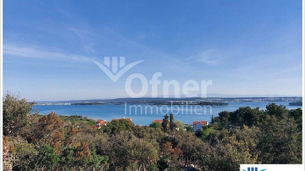 Grundstück zum Verkauf in Tkon, auf der charmanten Insel Pasman. Die Fläche des Grundstücks beträgt 2.343 m², davon sind ca. 1.030 m² im Baugebiet und ca. 1.313 m² außerhalb des Baugebiets. Das Grundstück bietet eine schöne Aussicht auf das Meer.