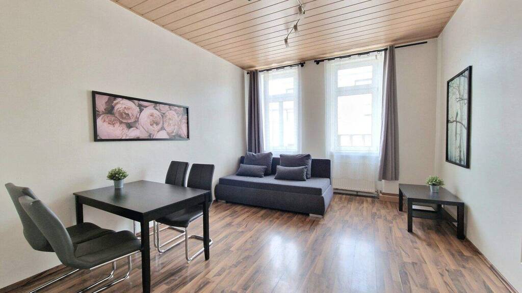 Vom einladenden Vorraum gelangt man in die voll ausgestattete Küche, die ebenso funktional wie gemütlich gestaltet ist. Das großzügige Wohnzimmer mit klassischem Altbaucharme bietet Raum zum Wohlfühlen und Entspannen, während das separate Schlafzimmer Ruhe und Rückzug verspricht. Ein modernes Bad mit Dusche sowie ein separates WC runden das Raumangebot ab.