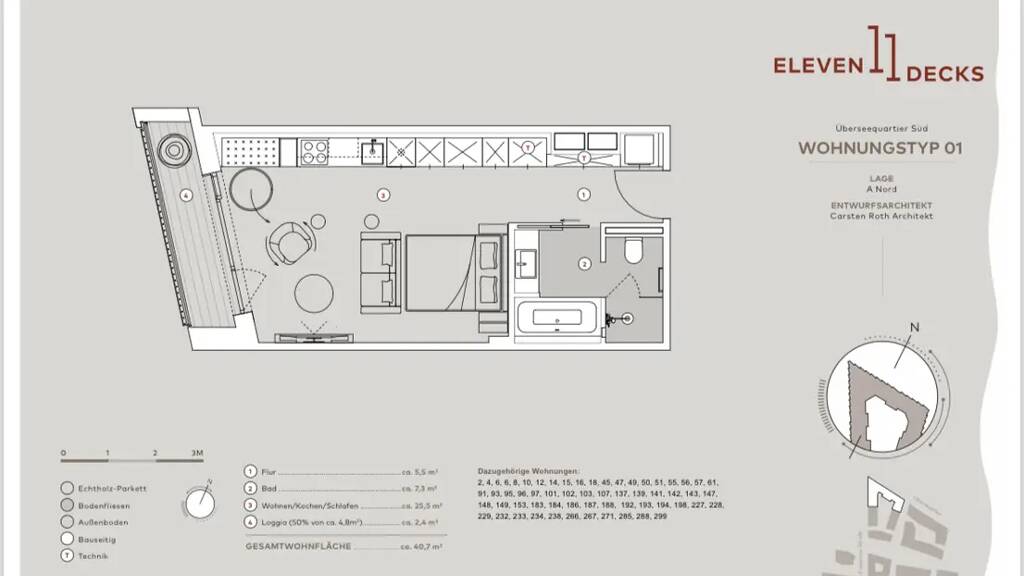 -Modernes innovatives Neubauprojekt âEleven Decksâ, ein architektonisches Highlight des renommierten ArchitekturbĂźros Carsten Roth -in Deutschland einzigartige und sehr schicke Communityspaces mit einem enormen Mehrwert: â˘Co-Working mit eigenen Schreibtischen (OpenSpace), private âThink Tanksâ zum ZurĂźckziehen, Lounge und kleiner Kitchenette â˘Club-House mit DesignkĂźchenzeile, Bar-Theke, Lounge und groĂem Essbereich, mĂśblierter AuĂenterrasse â˘Eigenes Fitnessstudio mit diversen verschieden Geräten von âTechnogymâ (Stepper, Bikes, Kinesis, Hanteln uvm.) â˘Energetischer Yoga-/ Mediationsraum â˘Gaming Room mit 5ft Billiard, TV und Spieltische â˘Concierge; Service-Point; 24/7 Paketannahme â˘BegrĂźnte Gemeinschaftsdachterrasse mit Outdoor-KĂźche â˘Parkähnlicher begrĂźnter Gemeinschaftsinnenhof -Repräsentative Eingangsbereiche und stilvolle Flure mit besonderem Interior-Konzept -Smarte LĂśsung fĂźr mehr Wohnkomfort: Community und Smart Home App (keyless WohnungstĂźr, Heizung- und Lampensteuerung) -Ca. 40 qm bis 200 qm Wohnflächen -306 Apartments auf 7 Hauseingänge verteilt -6. â 10. Wohnebenen (durch prägnante Terrassenbauweise) -Tiefgarage