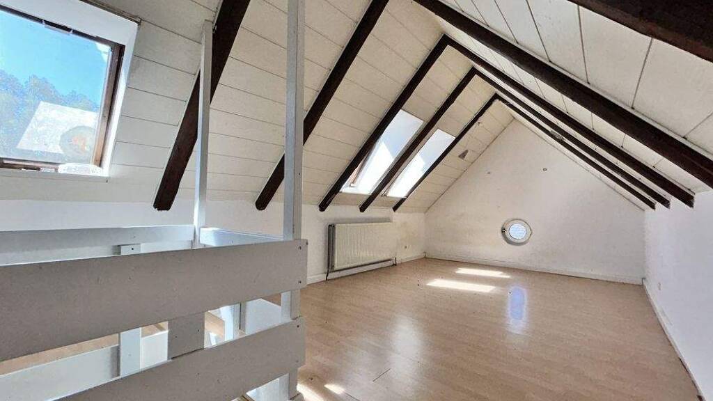 Sie betreten Ihr neues Zuhause über einen Windfang und eine Treppe. Vom Flur aus gelangen Sie in Bad und Küche zur linken und das (Wohn-) Zimmer und 2 Schlafzimmer über den angegliederten Flur zur rechten. Weiterhin erreichen Sie über eine Treppe das Studio, das sich herrlich zum Arbeiten nutzen ließe sowie den Bodenraum.