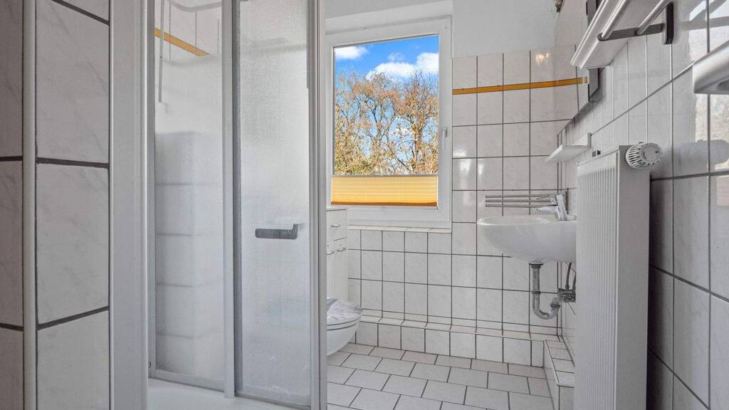 Über den hell gestalteten Eingangsbereich ist die einfach ausgestattete Wohnung über das Treppenhaus im 1. Obergeschoss erreichbar. Die etwa 60 m² große Wohnung erstreckt sich über einen Wohn-/Essbereich, ein Schlafzimmer, ein weiteres Zimmer, dem Bad und die Küche.