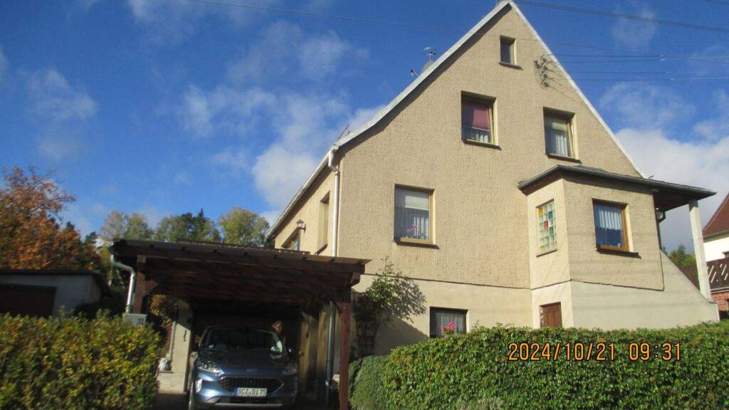 Das Anwesen wurde 1979 erbaut, verfügt über eine Gebäudenutzfläche von 194 m2, die Grundstücksgröße beläuft sich auf 500 m2. Bei bedarf kann weiteres Land dazu gepachtet werden. Weiterhin befindet sich auf dem Grundstück eine Garage, ein Schuppen mit elektr. Rolltor, sowie ein Carport. Die Beheizung erfolgt über eine Schwerkraftzentralheizung (Holz-Kohle). Welche sich mit dem Waschraum im Keller befindet. Dieser erstreckt sich über die gesamte Gebäudegrundfläche. Von hier ist auch der Zugang zum Carport möglich. Eine Teilsanierung wurde 2021 durchgeführt. - Thermofenster - Türen -Elektrik Das Objekt weißt einen guten Bauzustand auf. Der Haupteingang ist überdacht und befindet sich auf der Hausvorderseite. EG: Flur mit Marmorboden, Zugang zur Küche mit Festbrennstoffofen, Arbeitszimmer, sep. WC und geräumiges Wohnzimmer .In diesem begrüßt uns eine breite Fensterfront mit Zugang zur Terrasse, auf welcher Bodenfliesen verlegt sind. Vom dieser aus gelangt man zum Gartengrundstück mit einer überdachten Sitzecke. Desweiteren ereicht man vom Flur aus, über eine Steintreppe die Kellerräume. Sowie über eine Eichenholzfreitreppe das 1.OG. Hier sind ebenfalls Marmorböden verlegt. Das Bad ist mit Wanne, Wandfliesen, WC und Handwaschbecken ausgestattet. Es stehen drei weitere Räume zur freinen Verfügung. Der Dachboden kann über eine Holztreppe begangen werden.