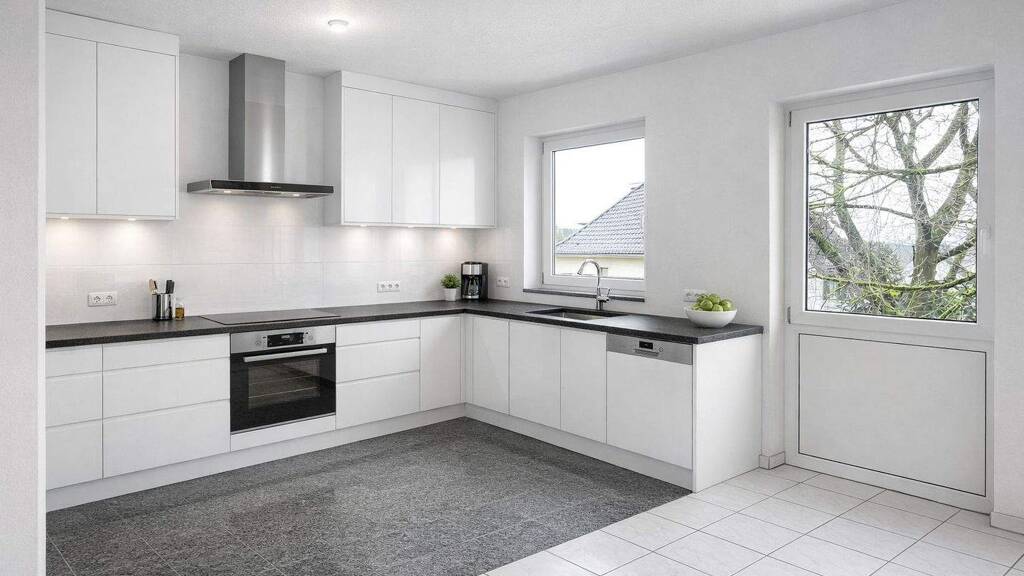 Der großzügige Flur bietet ausreichend Platz für eine Garderobe und verbindet alle Räume der Wohnung. Von hier aus gelangt man in den offenen Wohn- und Essbereich mit angrenzender Küche. Zwei bodentiefe Fenster und zwei weitere große Fenster sorgen für besonders viel Licht und eine einladende Atmosphäre. Die Küche bietet Platz für eine moderne Küchenzeile mit großzügiger Arbeitsfläche sowie einen gemütlichen Essbereich. Im Wohnbereich lässt sich problemlos eine großzügige Wohnlandschaft integrieren.