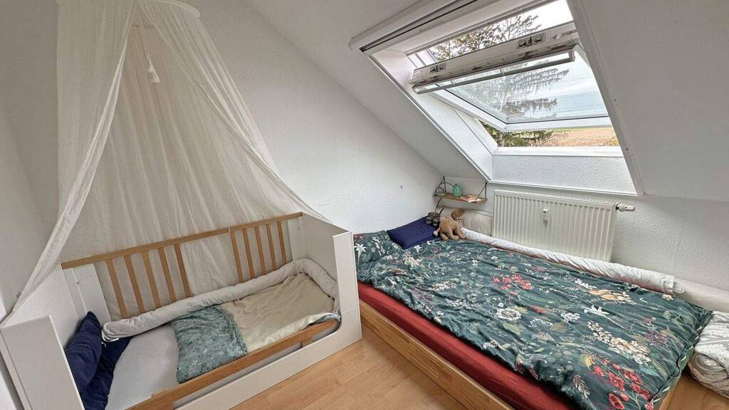 Über die Treppe erreichen Sie das Dachgeschoss. Dort befindet sich zunächst ein flexibel nutzbarer Vorraum sowie zwei weitere Zimmer, die sich ideal als Schlafzimmer und Arbeits- oder Büroraum eignen und zusätzliche Rückzugsmöglichkeiten schaffen.