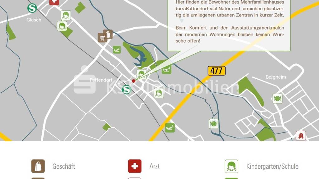 Bergheim ist die Kreisstadt des Rhein-Erft-Kreises und liegt an der Erft, die sich auf dem Stadtgebiet in mehrere Seitenarme teilt. Die beschauliche Mittelstadt mit über 62.000 Einwohnern befindet sich in der fruchtbaren Zülpicher Börde und liegt ca. 20 km westlich von Köln. Die Nähe zu den Ballungsräumen Köln/ Bonn, Aachen, Neuss/Düsseldorf und Mönchengladbach, mit verkehrsgünstiger Anbindung an die A1, A4 und A61, in Kombination mit der Ruhe und Beschaulichkeit eines ländlichen Umfeldes, machen Bergheim so beliebt. Sowohl mit dem Auto als auch mit öffentlichen Verkehrsmitteln erreichen Sie den Kölner Hauptbahnhof in ca. 40 Minuten und den Bonner Hauptbahnhof in etwas mehr als einer Stunde. Zwei internationale Großflughäfen in Köln/Bonn und Düsseldorf sind ebenfalls problemlos zu erreichen. Die Anbindung an das Bahnliniennetz der Deutschen Bahn und ein weitläufiges Busliniennetz sorgen für hervorragende Mobilität auch ohne Auto. Bergheim verfügt mit zahlreichen Geschäften, Arztpraxen, Kindergärten sowie sämtlichen Schulformen über eine sehr gute Infrastruktur. Ein ausgesprochen breites Sport-, Freizeit- und Kulturangebot lockt alle Aktiven. Vom Kulturtempel Medio.Rhein.Erft mit Veranstaltungen und Events, über Frei- oder Hallenbäder und Indoorspielplätzen, bis hin zu verschiedenen Fitnesscentern und Indoorsportcentern für Fußball, Tennis und Squash ist hier alles geboten. Der Segelflugplatz an der Wiedenfelder Höhe oder die Möglichkeit zum Kajakfahren im Erlebnisraum Rhein-Erft, der Golfplatz Am Alten Fliess und der Tierpark im Bergheimer Stadtteil Quadrath-Ichendorf bieten einen hohen Freizeit- und Erholungswert. Die Bergheimer Fußgängerzone zwischen Aachener und Kölner Tor ist Teil der mittelalterlichen Fernhandelsstraße und wird geprägt von historischen Gebäuden aus vergangenen Jahrhunderten. Mit ihrer Vielzahl an Läden und Cafés lädt sie zum Shoppen und Verweilen ein.