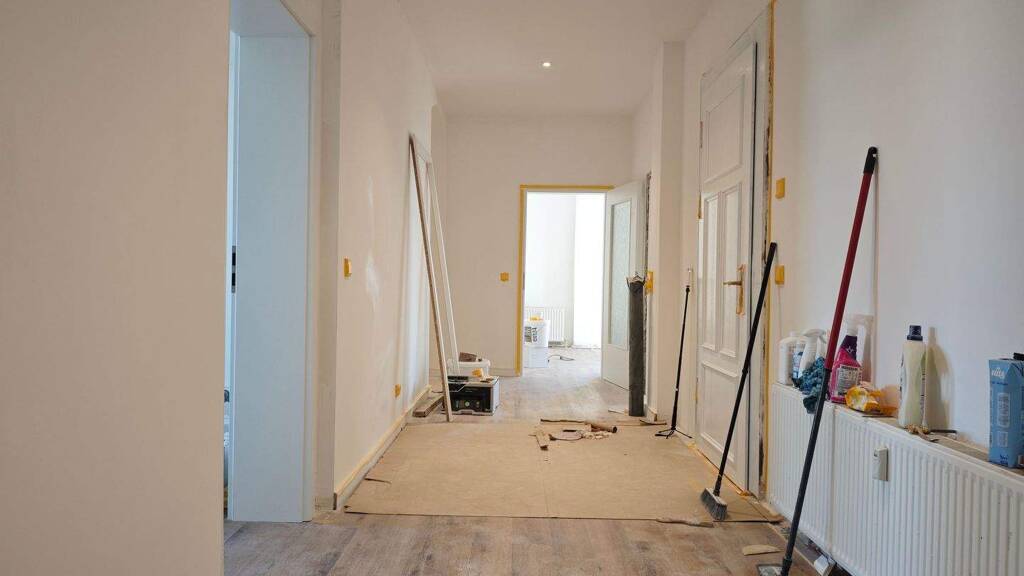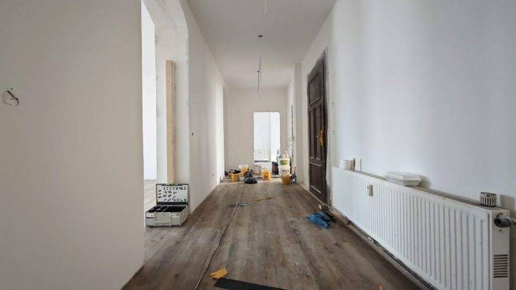 Im Zuge der Sanierung wurden u.a. der Grundriss optimiert, die Tapeten an Decken und Wänden enfernt, die Heizkörper lackiert, die Decken abgehangen, die Wände und Decken glatt verputzt, ein Handtuchheizkörper im Bad eingebaut. Außerdem wurden die Bodenbeläge in Flur und Wohnräumen, der Warmwasserboiler im Bad, die Wohnungselektrik vollständig und alle Türen und Zargen (außer Wohnungstür) erneuert. Außerdem werden die Badfliesen noch weiß gestrichen.