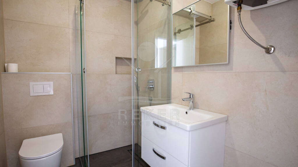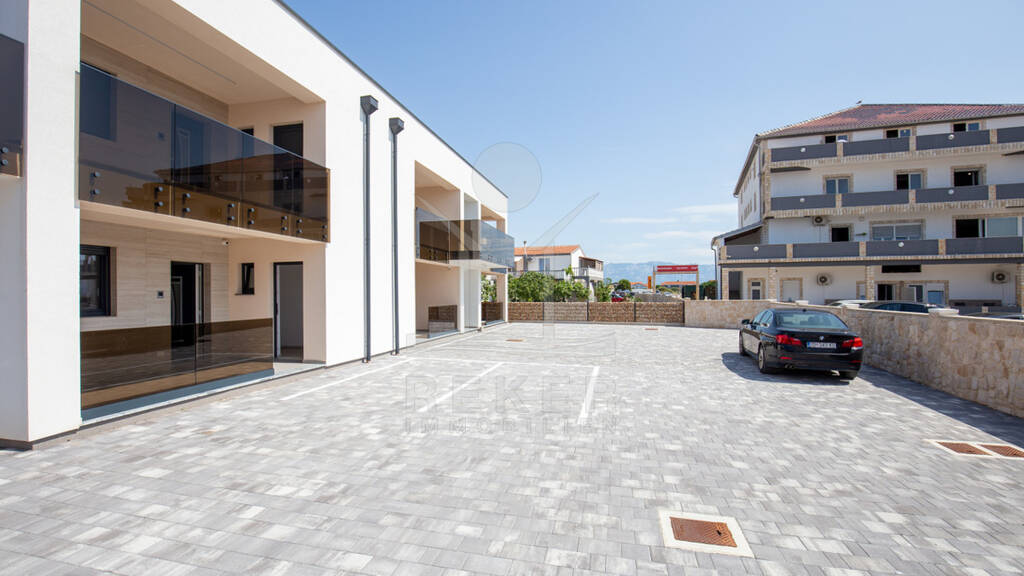 In der Stadt Vir, auf der gleichnamigen Insel, wohnen Sie hier ruhig, aber nie abgeschieden. Alles, was man im Alltag braucht, ist gut erreichbar. Die Umgebung ist gepflegt, modern bebaut und frei von Durchgangsverkehr. Ein paar Schritte genügen - und Sie stehen am Strand. Das Gebäude wurde 2025 fertiggestellt und überzeugt mit klarer, moderner Architektur. Insgesamt sechs Wohnungen verteilen sich auf zwei Etagen, je drei unten und oben. Jede Wohnung hat ihren eigenen Zugang. Vor dem Haus sind gepflasterte Flächen und für jede Wohnung ein eigener Parkplatz. Oben laden große Balkone mit Glasbrüstung zum Draußensitzen ein, unten gibt es überdachte Terrassen.