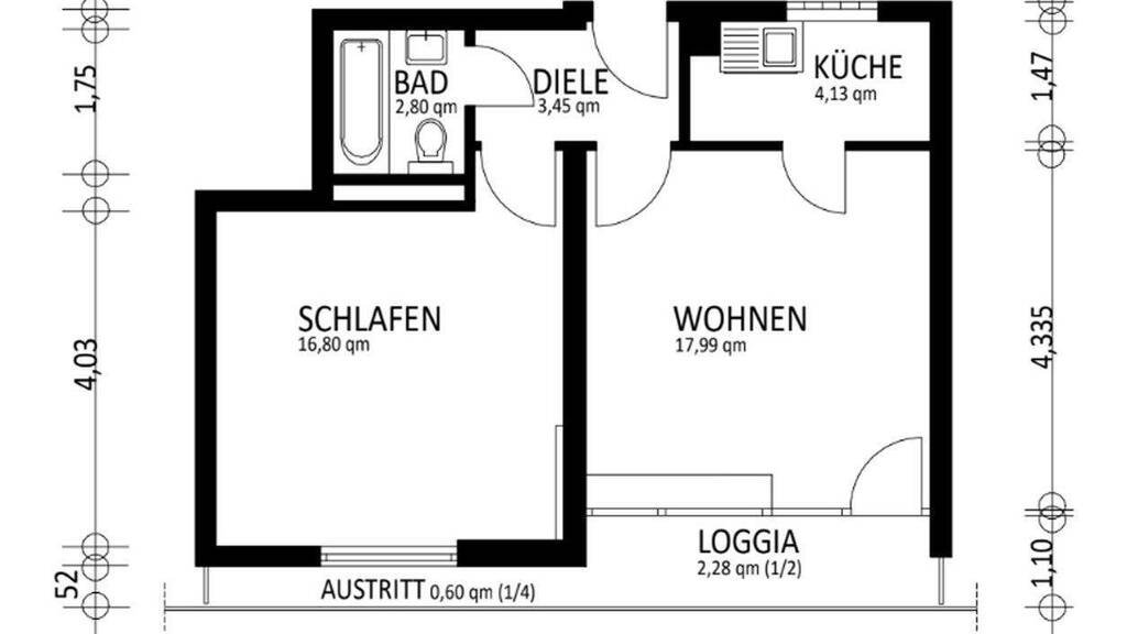 Der Grundriss ist praktisch geschnitten und umfasst ein helles Wohnzimmer mit offener Küche, ein separates Schlafzimmer, ein Badezimmer mit Badewanne sowie einen Balkon, der zusätzlichen Wohnkomfort bietet.