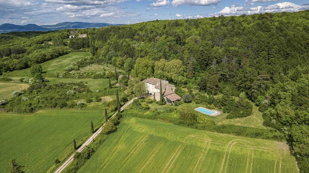 Outside: in front of the house is a terrace shaded by plane trees. The view overlooks the village and the meadows in the distance. A wood borders the house at the rear.