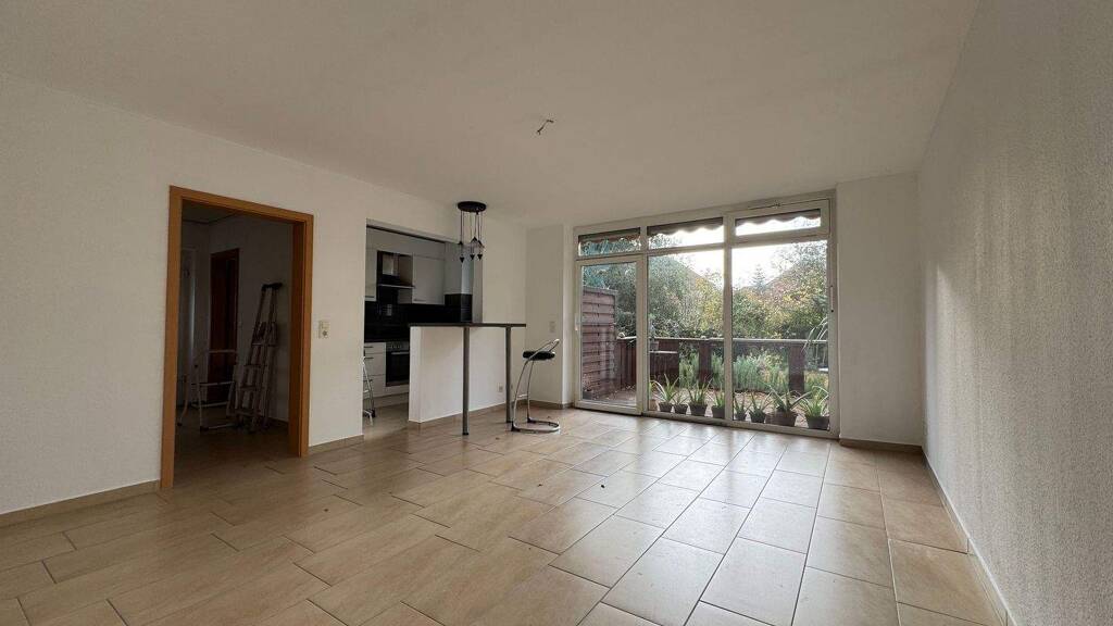 In der Rheinstraße 100 erwartet Sie eine frisch renovierte Wohnung mit einer Wohnfläche von ca. 62 m². Sie befindet sich in einem sehr gepflegten Haus und verfügt über einen eigenen, separaten Eingang - ideal für alle, die Wert auf Ruhe und Privatsphäre legen. Der Wohnbereich ist hell und freundlich gestaltet und bietet einen schönen Blick in den Garten. Von hier aus gelangen Sie auf die Terrasse samt Markise, die an sonnigen Tagen zum Entspannen einlädt. Die Wohnung ist vollständig gefliest und mit einer Fußbodenheizung ausgestattet, die für eine angenehme Wärme sorgt.