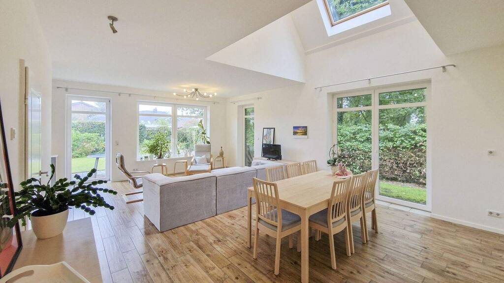 Bereits beim Betreten des Hauses empfängt Sie eine helle, galerieartige Diele, die den offenen und freundlichen Charakter des Hauses widerspiegelt. Von hier aus gelangen Sie sowohl in den großzügigen Wohn- und Essbereich als auch über eine Holztreppe in das Dachgeschoss.