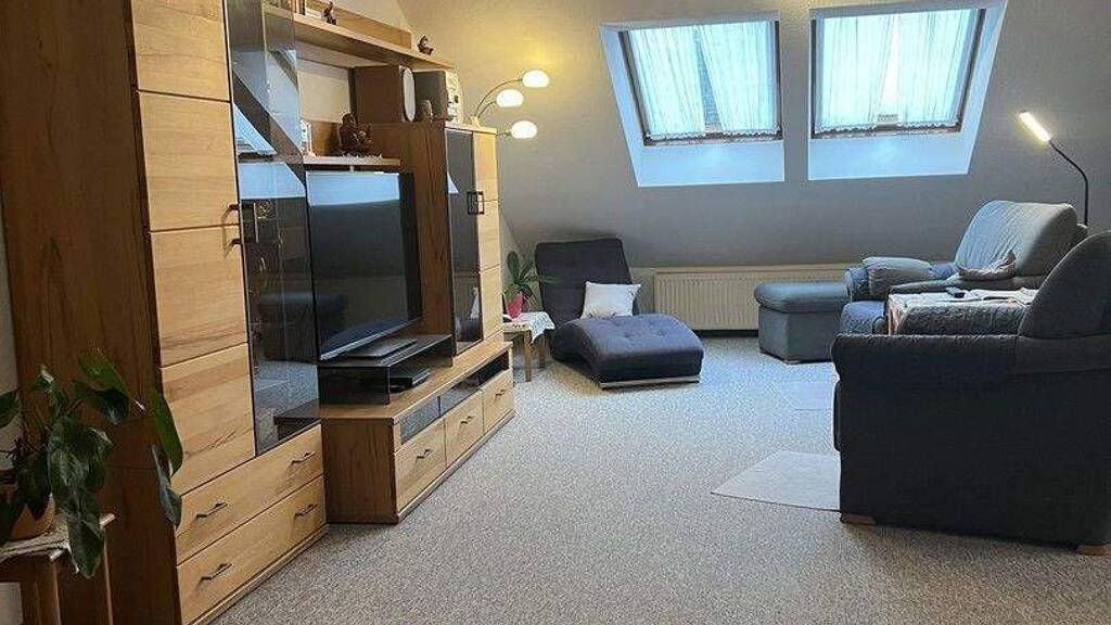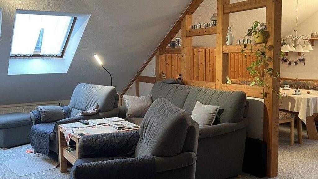 Diese helle 2-Zimmer Dachgeschosswohnung mit ca. 78 m² Wohnfläche befindet sich in Großenseebach. Die Wohnung verfügt über einen großen und voll überdachten Balkon mit Markise, der zum Entspannen einlädt, sowie eine ausgestattete Küche, die allerdings ein bisschen in die Jahre gekommen ist. Ein Keller mit ca. 20qm Nutzfläche bietet zusätzlichen Stauraum. Im Haus befindet sich darüber ein separater Waschkeller und Trockenraum. Die Wohnung wird ab dem 31.01.2026 verfügbar sein. Die Innenausstattung ist normal und teilweise renovierungsbedürftig (Teppichböden). Mit Zustimmung der anderen Eigentümer, würde ein Dachboden zum Ausbau zur Verfügung stehen.