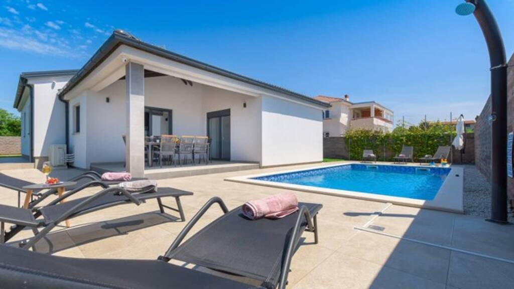 Energieausweis: ZU DIESER IMMOBILIE LIEGT DERZEIT NOCH KEIN ENERGIEAUSWEIS VOR. IN VORBEREITUNG. Diese moderne Residenz, die im Jahr 2020 fertiggestellt wurde, ist ein sorgfältig gestaltetes 145 m2 großes Haus mit einem 24m2 großen Swimmingpool, das sich einer ruhigen Straße auf einem 559 m2 großen Grundstück in einer ansprechenden Lage befindet.Es liegt nur 5 Minuten von der Umgehungsstraße von Pula, der Autobahn und einem belebten Einkaufszentrum entfernt und ist nur 10 Autominuten vom Zentrum von Pula entfernt.Das Haus verfügt über drei Schlafzimmer, jedes mit eigenem Bad, und eine geräumige Küche, die durch eine Glaswand abgetrennt ist und so eine einladende Atmosphäre schafft, die Wohnzimmer, Küche und Poolbereich nahtlos miteinander verbindet.Im Außenbereich neben dem Pool gibt es Liegestühle, einen Grillplatz und einen großzügigen Esstisch für geselliges Beisammensein. Der Poolbereich ist so gestaltet, dass ein Maximum an Privatsphäre gewährleistet ist, ergänzt durch einen gepflegten Rasen mit einem automatischen Bewässerungssystem und zehn Jahre alten Olivenbäumen.Dieses energieeffiziente Haus verfügt über ein A+-Zertifikat und ist mit Klimaanlage, Fußbodenheizung und Moskitonetzen an den Fenstern ausgestattet. Der Pool funktioniert nach dem Prinzip der Elektrolyse und bietet Hydromassage, Jacuzzi-Bänke und die Möglichkeit der Poolheizung.Ob für eine Familie, die einen außergewöhnlichen Lebensraum sucht, oder als verlockende Investitionsmöglichkeit für ein Ferienhaus, diese Immobilie erfüllt beide Rollen nahtlos.Das Haus wird komplett möbliert angeboten und bietet Interesse? Bitte senden Sie uns ein VOLLSTÄNDIG augefülltes Kontaktformular zu, Sie erhalten dann umgehend ein ausführliches Exposé. ACHTUNG MAKLER: Wir freuen uns auf eine Zusammenarbeit. Alle Angaben stammen vom Verkäufer der Immobilie. Ohne Gewähr! blueHOMES AG ...die schönsten Häuser Europas...