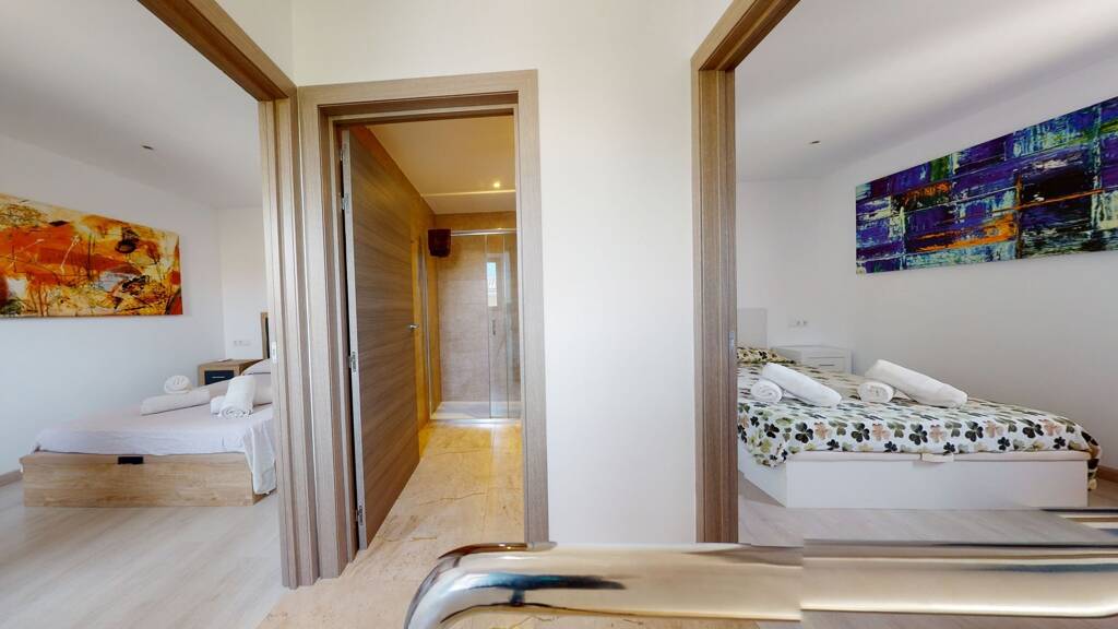 Im Obergeschoss findet man 4 Doppelschlafzimmer und 2 Badezimmer vor. Klimaanlagen (heiß/kalt) sind in den Räumlichkeiten verteilt und die Fenster haben Klimalitverglasung.