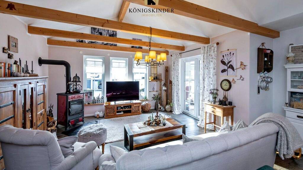 Mit insgesamt 4,5 Zimmern überzeugt das Haus durch seinen offenen und lichtdurchfluteten Grundriss. Der großzügige Wohn- und Essbereich ist offen gestaltet und verfügt über eine integrierte Küche. Ein freistehender Kaminofen sorgt hier an kalten Wintertagen für zusätzliche Gemütlichkeit. Das große Tageslichtbad en Suite ist ein echtes Wohlfühlhighlight und ausgestattet mit einer ebenerdigen Dusche sowie einer integrierten Sauna. Ein separates Gästebad mit WC sowie hochwertige Design-Vinyl-Bodenbeläge im gesamten Wohnbereich runden die Innenausstattung ab.