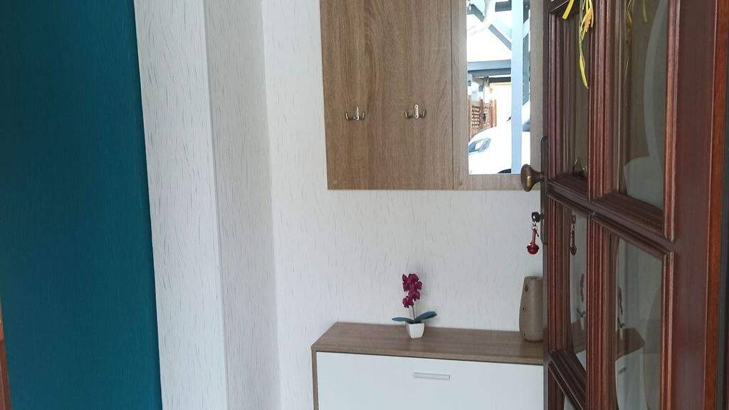 Die Wohnung befindet sich im 1. OG und besitzt einen eigenen Hauseingang. Im unteren Eingangsbereich ist eine Garderobe installiert. Von hier führt eine hübsche Holztreppe in das 1. OG, in dem sich die eigentliche Wohnung befindet.