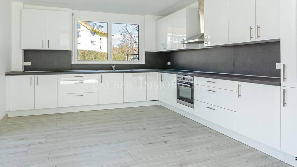 Die moderne Einbauküche ist vollständig ausgestattet und steht dem Mieter zur Nutzung zur Verfügung. Auch von der Küche aus gelangen Sie auf eine Terrasse.