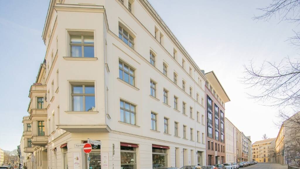 This unique maisonette flat is situated in Berlin Mitte, right on the Gipsdreieck at the corner building on Joachimstraße and Auguststraße, on the 4th and 5th floors of the rear building.