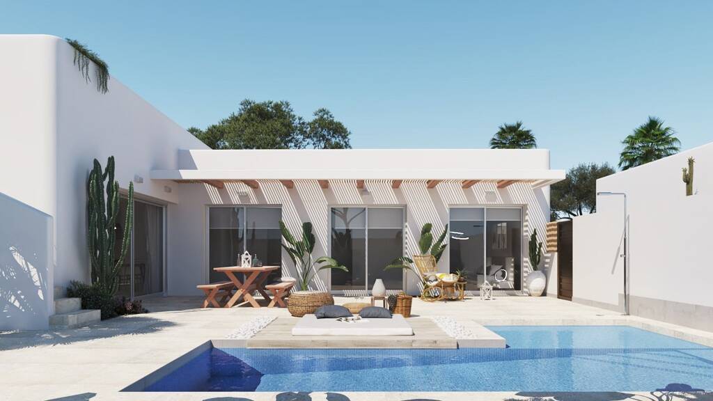 Die Villen sind alle auf einer Ebene mit einer Dachterrasse, die Innenaufteilung besteht aus einem geräumigen offenen Wohn- und Essbereich mit moderner amerikanischer Küche, separater Hauswirtschaftsraum, Master-Suite mit großem Schlafzimmer, en-suite Badezimmer und Ankleidebereich / begehbarer Kleiderschrank, zwei weitere Doppelschlafzimmer und ein separates Gästebad. Das Wohnzimmer und alle drei Schlafzimmer haben große Terrassentüren, die viel natürliches Licht in das Haus lassen und Zugang zur Terrasse und zum Garten mit privatem Swimmingpool bieten, wo man sich entspannen und im Freien essen kann. Über eine Außentreppe gelangt man auf die 42 m2 große Dachterrasse, von der aus man den ganzen Tag über die herrliche Aussicht und die Sonne genießen kann. Zu den Optionen der Villa gehört ein Kellergeschoss aus Beton und Ziegeln mit Vorinstallationen für Beleuchtung, Wasser und Klimaanlage. Das Kellergeschoss ist über die Innentreppe der Immobilie zu erreichen und bietet Ihnen die Möglichkeit, zusätzlichen Wohnraum oder Stauraum innerhalb der Villa zu schaffen, ganz nach Ihren Bedürfnissen und Anforderungen.