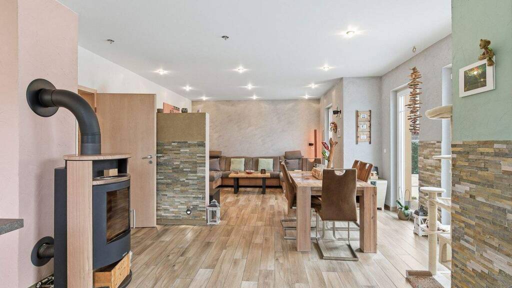 Auf ca. 144 m² Wohnfläche verteilen sich fünf gut proportionierte Zimmer, die durch ihre klare Struktur vielfältige Nutzungsmöglichkeiten eröffnen. Die Bodenbeläge aus Holz-Dekor Fliesen unterstreichen den gepflegten, modernen Charakter. Das Master Schlafzimmer ist mit einer Split-Klimaanlage ausgestattet und bietet auch an warmen Tagen ein angenehmes Raumklima. Das moderne Wannenbad verfügt über ein Fenster, ergänzt durch ein separates Gäste-WC mit Dusche. Kunststofffenster und eine Einbauküche fügen sich harmonisch in das Gesamtbild ein. Das Haus ist nicht unterkellert.