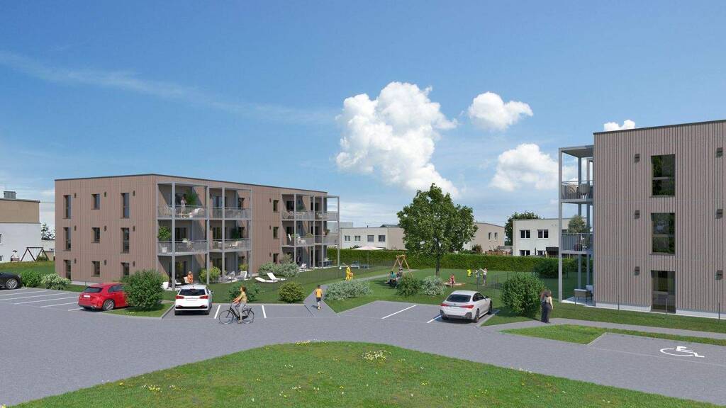 Das Grundstück liegt nordöstlich des Ortszentrums der Gemeinde Haag am Hausruck in unmittelbarer Nähe zum Sportplatz und zum Freibad. Das Gemeindeamt und der Ortsplatz sind fußläufig in 15 Min. erreichbar. Einkaufsmöglichkeiten bieten sich in 10 Min. Entfernung zu Fuß. In der Sportplatzstraße errichtet die OÖ Wohnbau 2 dreigeschoßige Wohnhäuser mit 12 Wohnungen pro Haus in Miete. Die Wohnhäuser werden - unter dem Aspekt der Nachhaltigkeit - in Holzmassivbauweise mit hinterlüfteter Holzfassade errichtet. Im Haus 1 werden die Innenwände der Wohnungen vorrangig aus naturbelassenem Sichtholz (Oberfläche: Fichte) hergestellt, teilweise aber auch mit Gipskarton bekleidet (Oberfläche: weiß gemalt). Die Decken werden in naturbelassener Sichtholzoberfläche ausgeführt. Die Innenwände in den Wohnungen im Haus 2 werden großteils aus Massivholz hergestellt, jedoch vollständig mit Gipskarton in der Farbe weiß beplankt. Ebenso ist eine naturbelassene Holzdecke (Oberfläche: Fichte) sichtbar. Zur Auswahl stehen 2-Raum- und 3-Raum-Wohnungen in den Größen von ca. 50 m²- 70 m². Jede Wohnung verfügt über einen großzügigen Balkon in den Obergeschoßen. Die Erdgeschoßwohnungen werden mit einer Terrasse und einem Eigengarten ausgeführt. Beide Baukörper sind teilweise unterkellert, wo Waschküche, Kellerabteile und Haustechnik untergebracht sind. Zum Wohnhaus angrenzend werden Parkplätze für Bewohner und Besucher errichtet. Unter dem überdachten Hauseingangsbereich haben Sie die Möglichkeit Fahrräder abzustellen. Die Wohnanlage wird in Holzmassivbauweise mit Holzfassade errichtet und nach der Neubauförderungs-Verordnung 2019 gefördert. Beide Wohnhäuser werden mit Fernwärme versorgt. Für ein angenehmes Raumklima sorgen komfortable Einzelraumlüftungsgeräte.