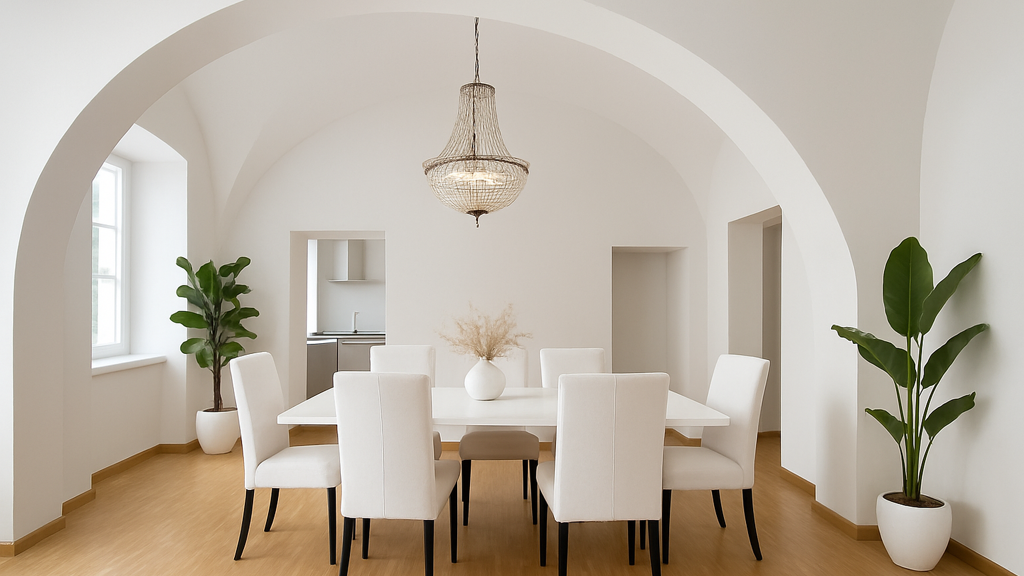 Der großzügige Wohn- und Essbereich bildet das Herzstück der Wohnung. Hier beeindrucken hohe Gewölbedecken und nostalgische Sprossenfenster, die dem Raum eine unverwechselbare Eleganz verleihen. Die angrenzende, separate weiße Einbauküche ergänzt den Bereich ideal.
