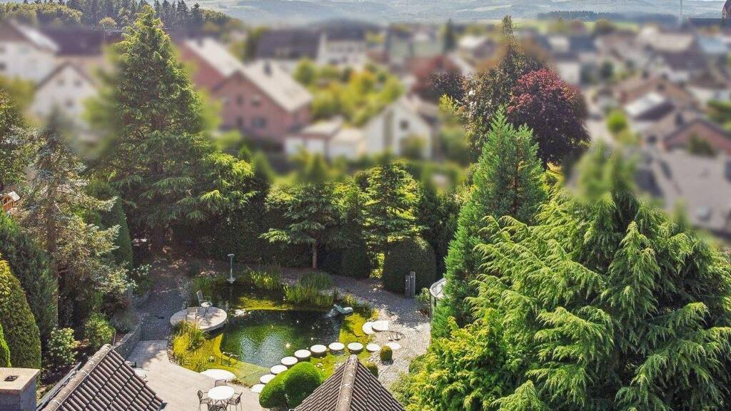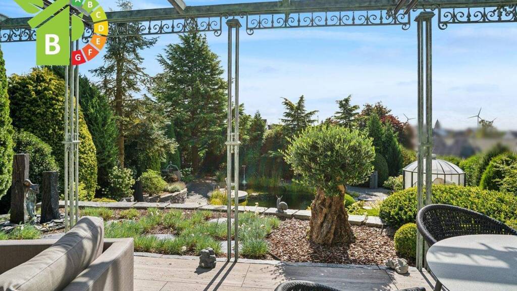 Das absolute Highlight ist das traumhafte Grundstück mit einem liebevoll angelegten Schwimmteich, mit einer ca. 50 m² Terrasse, inklusive seltener Koi-Fische, einer Warm-Kalt-Wasser Dusche am Teich, einem 360° drehbaren Pavillon im Sonnenverlauf sowie einer überdachten Terrasse mit elektrischen Sonnenschutzrollos - eingebettet in eine parkähnliche Gartenlandschaft.
