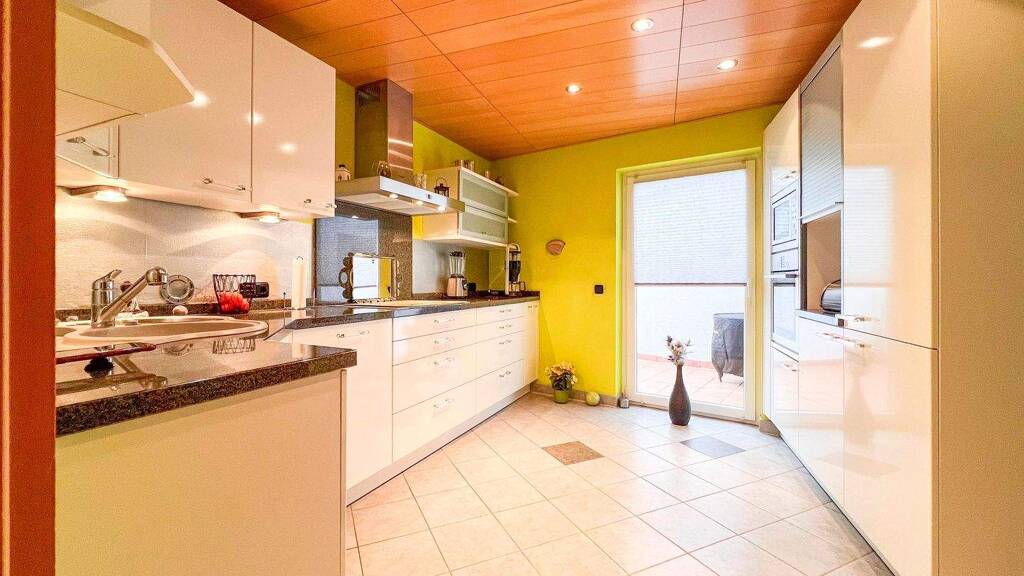 Die weitläufige Küche mit Zugang zu einem geschützten Balkon bietet ideale Voraussetzungen, um die Abendsonne in ruhiger Atmosphäre zu genießen. Auf dieser Ebene befinden sich zudem ein Gäste-WC und eine praktische Abstellkammer.