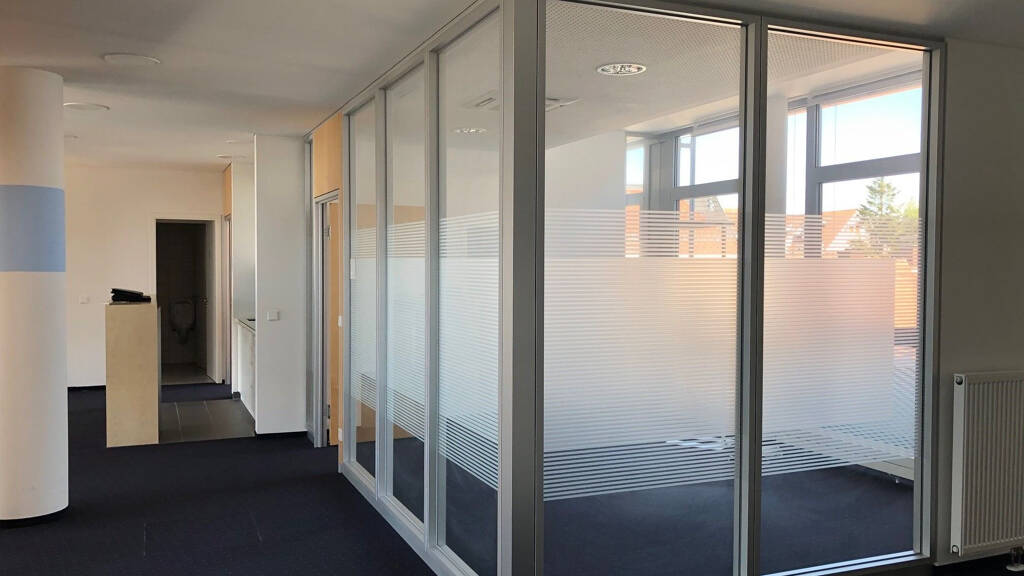 Die Büroflächen sind mit bodentiefen Außenfenstern, Sonnenschutz durch Außenjalousien und modernen Innenstores ausgestattet. Die Raumtrennwände zum Flur bestehen aus bodentiefen Glaselementen. Die Verkabelung erfolgt über den Bodenkanal. Ein Küchenbereich (Spüle, Kühlschrank, Spülmaschine) mit Theke ist in attraktiver Weise im Flurbereich integriert. Das Raumklima kann individuell durch die vorhandene Klimaanlage reguliert werden. Die Innenbeleuchtung erfolgt in den Bürobereichen über moderne Stehleuchten. Der codierte Bürozugang erlaubt jedem Berechtigten den schlüssellosen Zugang. Die Büroetage im Dachgeschoss verfügt über einen begehbaren Balkonbereich auf der Nord-Ost- wie auch auf der Süd-Westseite.