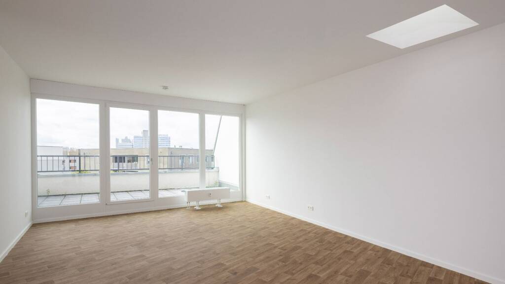 Die 102,83 m² große Dachgeschosswohnung verfügt über zwei Schlafzimmer, ein Wohnzimmer mit offener Küche und einem Balkon. Zudem gibt es eine Badezimmer mit Badewanne.