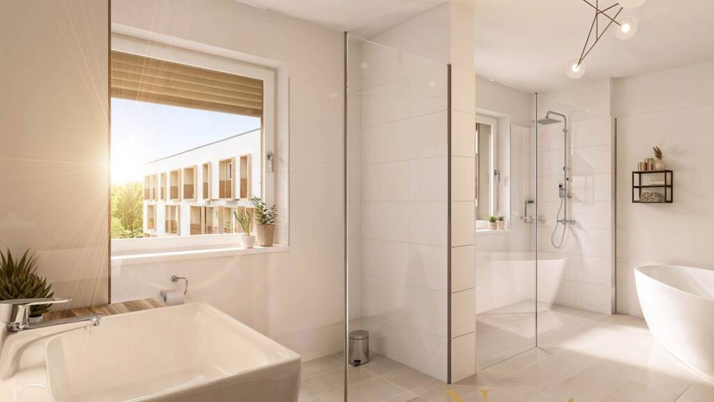 Zwei Schlafzimmer bieten ausreichend Raum für Rückzug und Privatsphäre. Das Badezimmer ist hochwertig ausgestattet mit Badewanne, Doppelwaschbecken, Waschmaschinenanschluss und Handtuchheizkörper. Ergänzt wird das Raumangebot durch einen praktischen Abstellraum bzw. eine Speis.