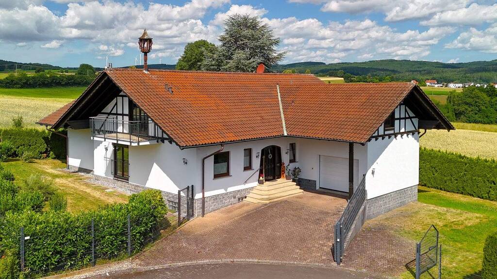 Dieses Einfamilienhaus im klassischen Landhausstil bietet rund 194?m² Wohnfläche – großzügig, offen und mit viel Licht. Das bereits vorbereitete Dachgeschoss lässt sich ausbauen und erweitert das Raumangebot auf ca. 340?m² – ideal für Gäste, Familie oder die Verwirklichung eigener Projekte. Vom Balkon aus eröffnet sich ein weiter Blick in die umliegende Natur – ein Ausblick, der jeden Tag aufs Neue entschleunigt. Der offene Wohnbereich im Erdgeschoss schafft mit edlem Marmorboden und Fußbodenheizung eine behagliche Atmosphäre. Ein Kaminofen mit Holzfeuerung sorgt an kühleren Tagen für gemütliche Stunden. Das ca. 910?m² große Grundstück ist vollständig eingefriedet und von außen nicht einsehbar. Es bietet Privatsphäre und eine ruhige Lage mit unverbaubarem Fernblick in die Natur. Im Untergeschoss befindet sich eine separate Einheit, die sich flexibel nutzen lässt – ob als Einliegerwohnung, Büro oder Atelier. Der Dachgeschossausbau ist vorbereitet und kann über eine Außentreppe samt eigenem Zugang erreicht werden. Eine große Garage mit Strom- und Wasseranschluss (dadurch auch als Werkstatt geeignet) und 2 Tageslichtfenstern, zwei weitere Stellplätze sowie Platz für einen Wohnwagen bieten Ihnen alle Flexibilität, die Sie brauchen.